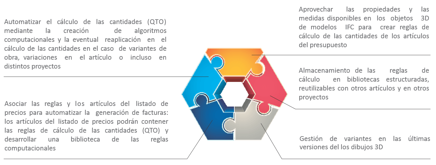 Para la mayoría del software CAD, la interoperabilidad está garantizada a través de los archivos IFC (Building Smart). A través de la importación y lectura de los ficheros *.ifc con información, ya sea de la arquitectura, ya sea de otras especialidades (estructura, instalaciones, etc.), es posible estimar cantidades y tiempos. La integración de los ficheros IFC permite además el reajuste de cantidades resultantes de una alteración de proyecto con solo actualizar el fichero IFC.
